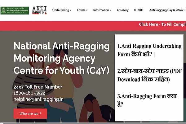 यह फॉर्म UGC की आधिकारिक वेबसाइट www.antiragging.in पर भरा जाता है। “anti ragging helpline number” 1800-180-5522 है |